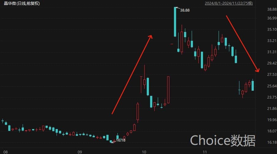 二级市场方面,晶华微公告被立案的下一个交易日(11月18日)收盘大跌15.31%,拉长时间来看,晶华微股价自9月18日低点迄今累计最大涨幅140%。