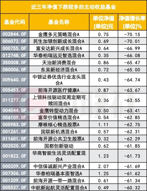 其中,近三年净值下跌最多的是金鹰多元策略混合,跌去70.15%,民生加银创新成长混合跌去70.01%,富安达新兴成长混合、华泰柏瑞远见智选混合、天治新消费混合、东吴新经济混合近三年净值下跌超过65%。