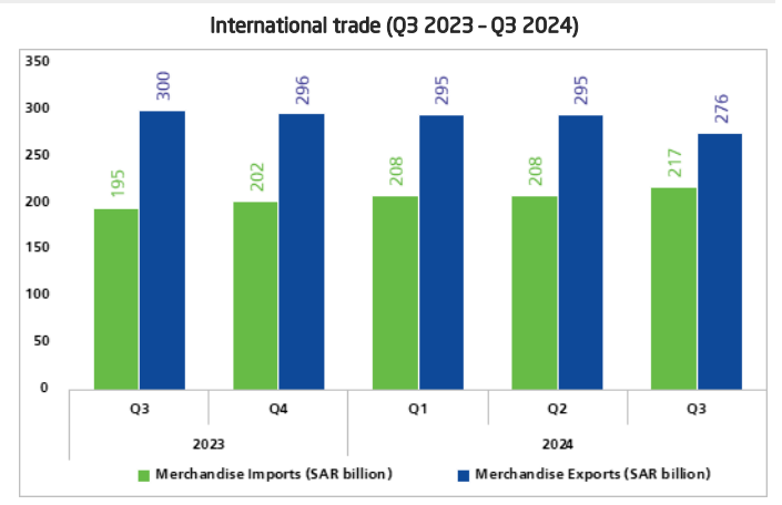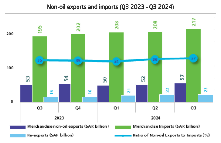 沙特“2030愿景”计划将加强非石油私营部门作为关键目标,旨在通过多元化经济来降低对石油的依赖。GASTAT指出,2024年第三季度,非石油出口(包括再出口)占进口的比例从2023年同期的34.9%提升至36.6%,这得益于非石油出口增长16.8%和进口增长11.4%。