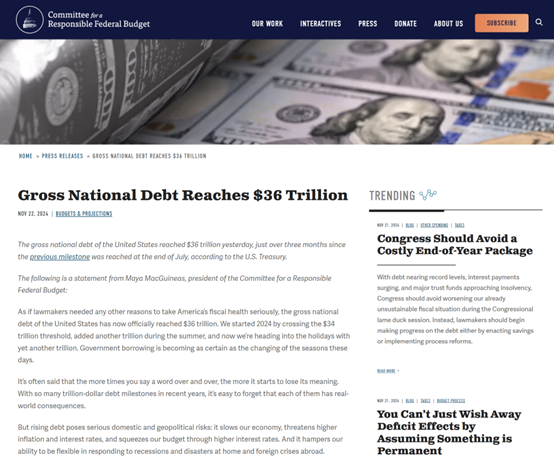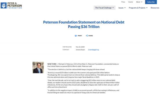 “选举已经结束,但国家债务仍在继续全速上升,” 倡导财政可持续性的彼得·G.彼得森基金会(Peter G.Peterson Foundation)的首席执行官迈克尔·彼得森在一份声明中表示。“今年夏天,美国的债务超过了35万亿美元,在感恩节前突破了36万亿美元。这种债务螺旋式上升必须停止。”