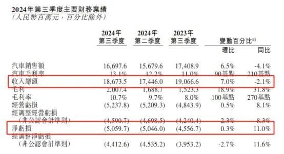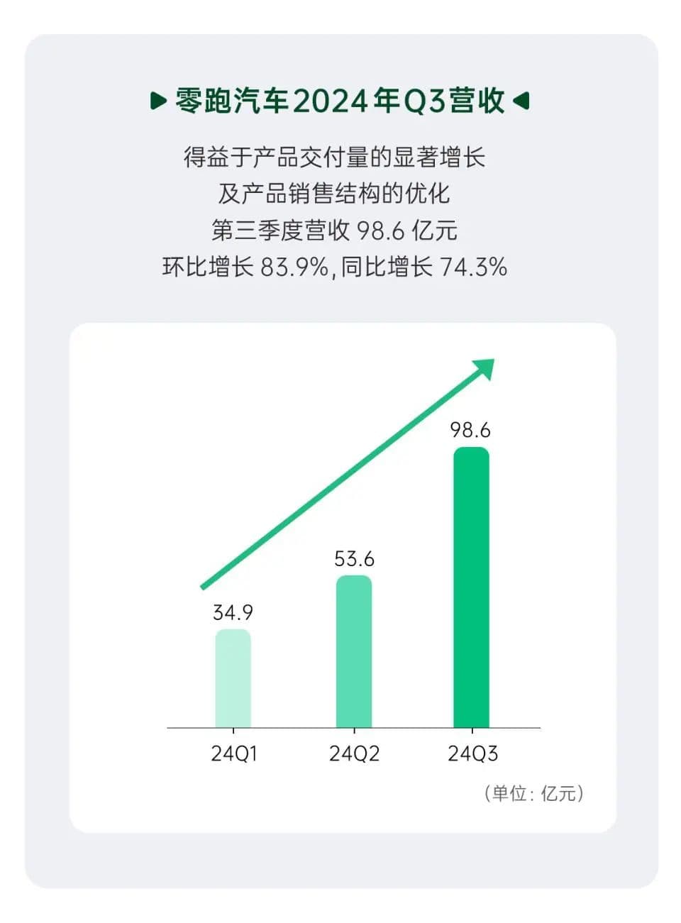 三季度,零跑汽车实现收益98.6亿元,较第二季度环比增长83.9%,与2023年同期相比增长74.3%,毛利率达到8.1%。经调整后净亏损为人民币5.4亿元,与上一季度相比有所减少。