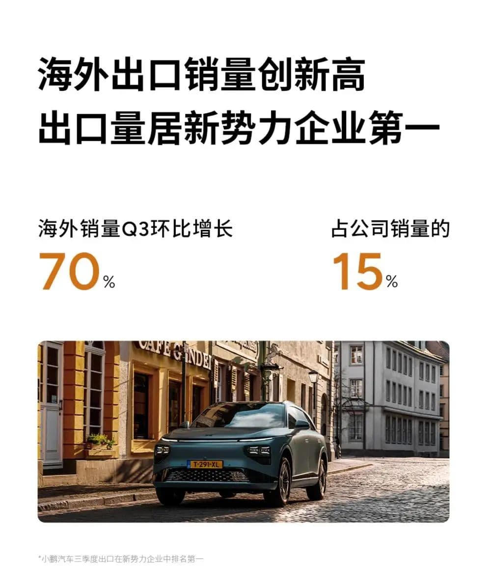 值得注意的是,小鹏汽车三季度海外销量环比大增70%。三季度,小鹏汽车还成功进入新加坡、西班牙、葡萄牙等新市场,30多个国家,门店超110家。2025年,小鹏计划扩展销售网络至北美外90%新能源车市场,门店增至300家以上。
