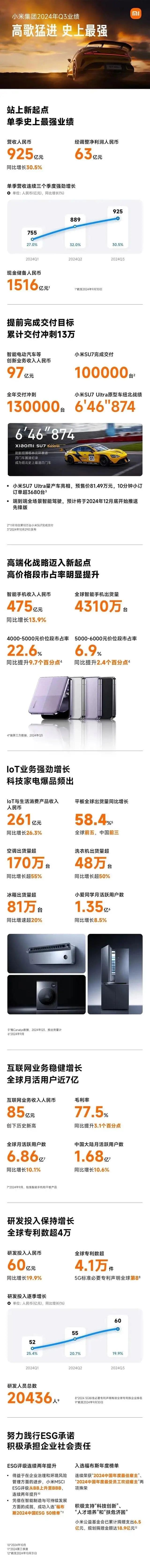 三季度,小米集团总收入925亿元人民币,同比增长30.5%,创历史新高。经调整后净利润为人民币63亿元,同比增长4.4%,其中包含了智能电动汽车等创新业务所产生的15亿元经调整净亏损。