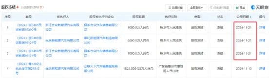 记者查阅天眼查发现,哪吒汽车母公司合众新能源股份有限公司在2024年11月19日新增了一条高达10亿元的股权冻结信息,案号为(2024)浙0483民诉前调15604号。