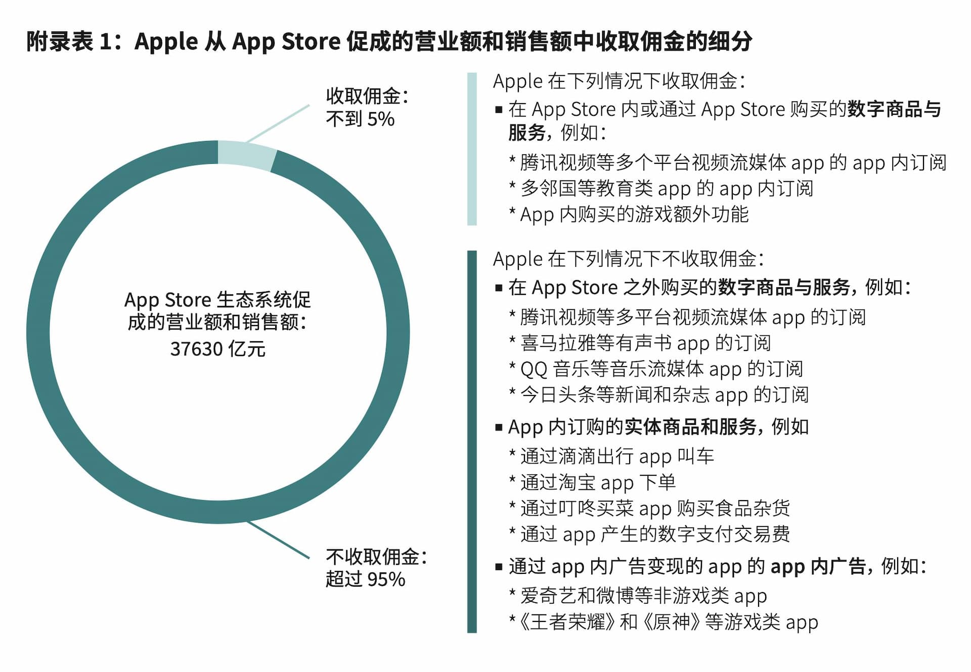 但显然我们不能直接用 3.763 万亿元这个数字按 30% 的费率计算苹果的佣金,因为并不是所有 App Store 生态内的交易都要给苹果抽成。根据苹果的说法,苹果不会对 App 之外数字商品购买、App 内实体商品购买、App 内广告收费。