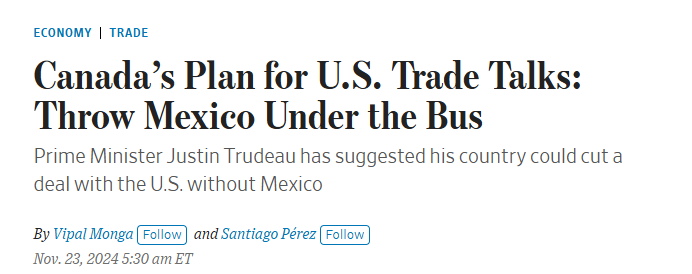 此前,曾有媒体报道称,随着明年三国将开始对美墨加协定进行预定的审查,包括总理贾斯汀·特鲁多和财政部长在内的加拿大政府高层已表示,他们准备单独与当选总统特朗普达成一项新协议,并将墨西哥排除在外。