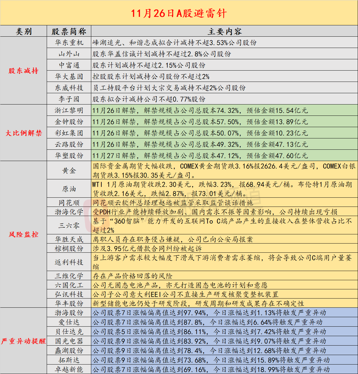 导读:财联社11月26日投资避雷针,近日,A股及海外市场潜在风险事件如下。国内经济信息方面包括:1)上海钢联发布数据显示,电池级碳酸锂价格较上次下跌600元,均价报7.91万元/吨;2)广电总局出手整治“霸总”微短剧,防止通过拜金、炫富等制造爽点;公司方面重点关注包括:1)同花顺云软件总经理赵远被监管采取监管谈话措施;2)7连板渤海化学提示风险,受PDH行业产能持续释放加剧、国内需求不振等因素影响,公司持续出现亏损;海外市场重点关注包括:1)国际贵金属期货大幅收跌,COMEX黄金期货跌3.16%;2)WTI原油期货收跌3.23%。