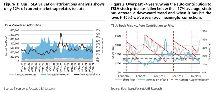 瑞银在这份报告中还指出,特斯拉的股价已发出警告信号,表明其估值可能正在接近近期高点。目前,特斯拉的汽车业务仅占其总估值的12%。