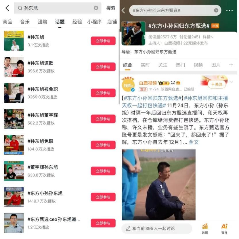 #东方小孙回归东方甄选#成为各大社交平台的热门榜单,在微博,该话题有近三千万的阅读量;在抖音,孙东旭相关的话题也有超过4亿的播放量;围绕在“孙东旭和董宇辉”身上的话题更是数不胜数,而这些话题很长一段时间都会随着孙东旭的出现,转化为东方甄选直播间的流量和销量。