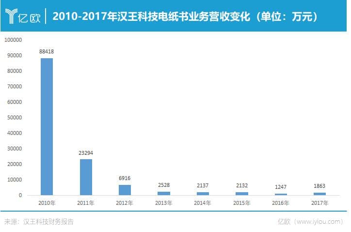 在移动互联网如日中天的十年间,汉王科技电纸书业务的发展结局可想而知。到2017时,电纸书业务营收仅1863万元,较2010年相比,七年间下滑97.89%。