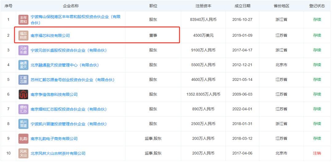 天眼查显示,卢语在3家公司担任高管,除了现已注销的风林火山古树茶叶以外,另外两家公司分别为南京福芯科技有限公司(下称“福芯科技”)和南京礼韵电子商务有限公司,卢语的职位分别为董事和监事。此外,卢语还在多家股权投资公司担任股东职务。其中,或与此次股份转让能产生关联的是福芯科技这家公司。