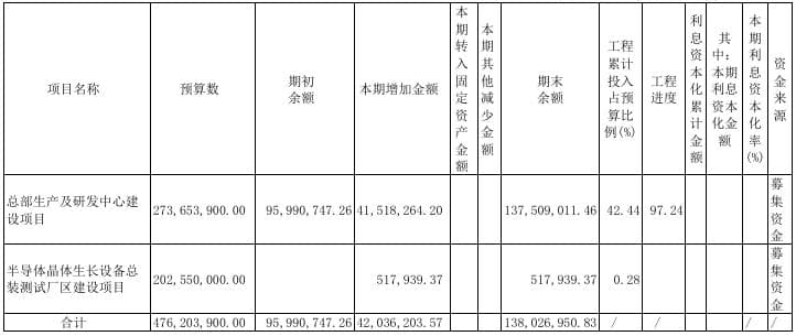 2023年4月,晶升股份上市募资的目的,就是建设总部生产及研发中心和半导体晶体生长设备总装测试厂区,合计预算为4.76亿元。如今一年多过去,截至今年6月末,总部建设项目工程进度已完成97.24%,测试厂区建设项目刚刚开始,二者合计投入资金1.38亿元。