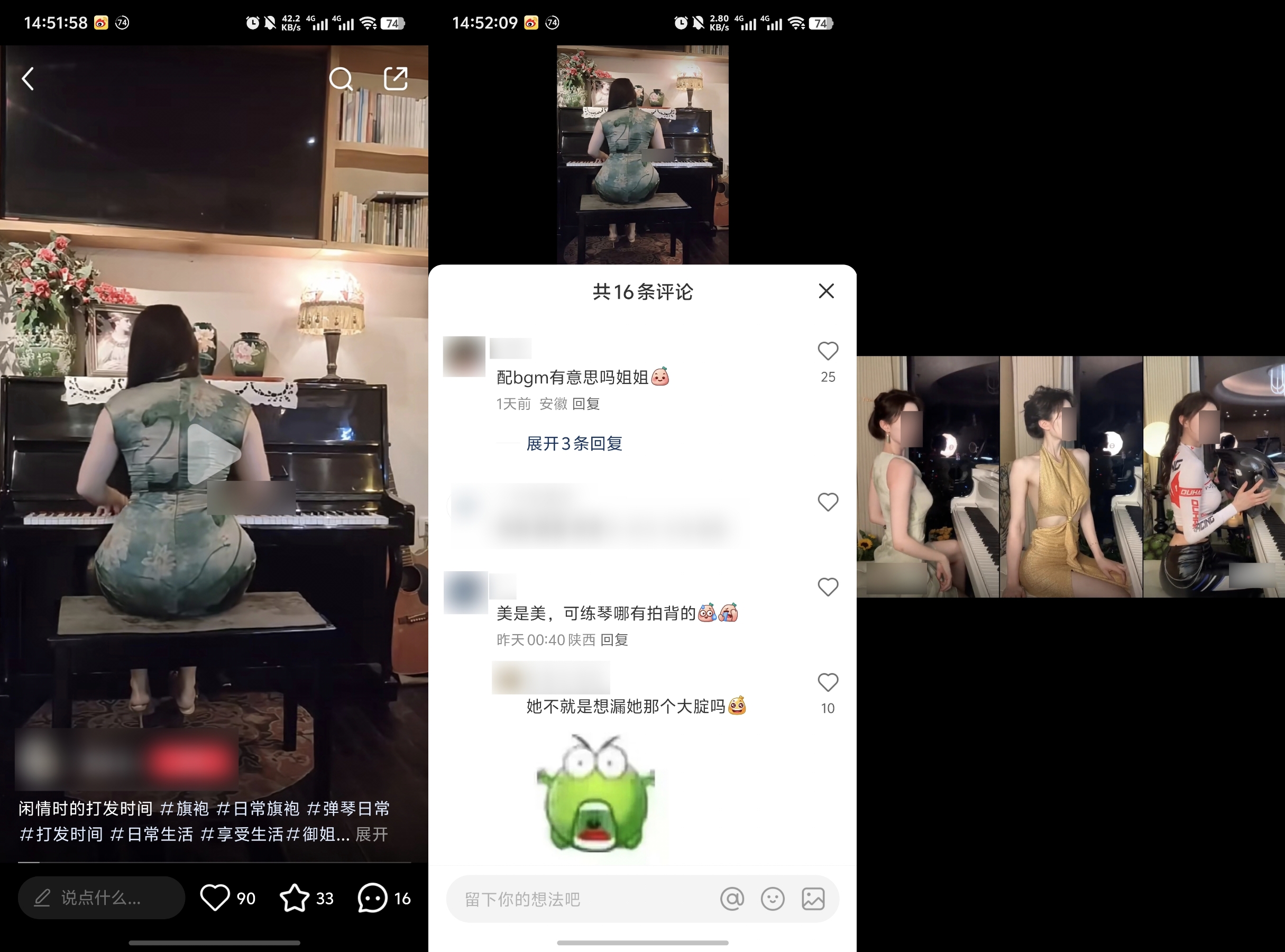 小雷观察到,有短视频博主装扮成钢琴演奏者,假借分享弹琴日常的名义,故意展示自己臀部或胸部等敏感位置,同赛道还有更离谱的博主,硬是把弹琴变成了擦边换装秀。