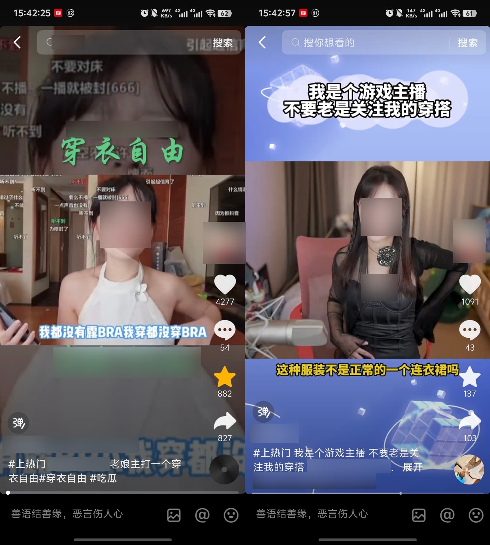 第三类擦边博主打着“穿衣自由”的旗号,表达“女性也有按照自己喜好穿衣的权利”。她们总是会强调观众关注自己的本职工作,而不要关注其穿着,但事实上却一直穿着暴露引人遐想,在追求自由的路上过分强调身体的展示,走的是反差路线。