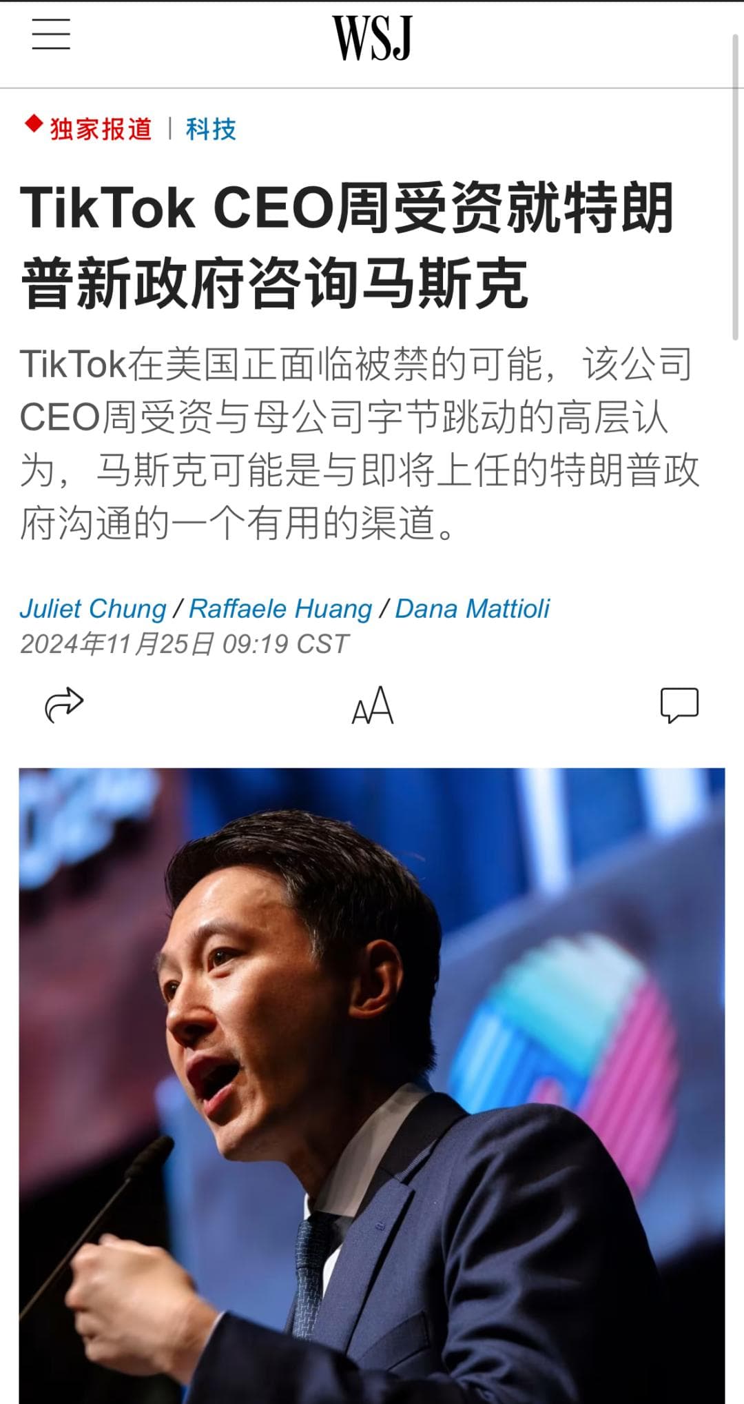 就在近日,据《华尔街日报》报道,TikTok CEO周受资就特朗普新政府咨询美国“第一兄弟”——马斯克(Elon Reeve Musk)。