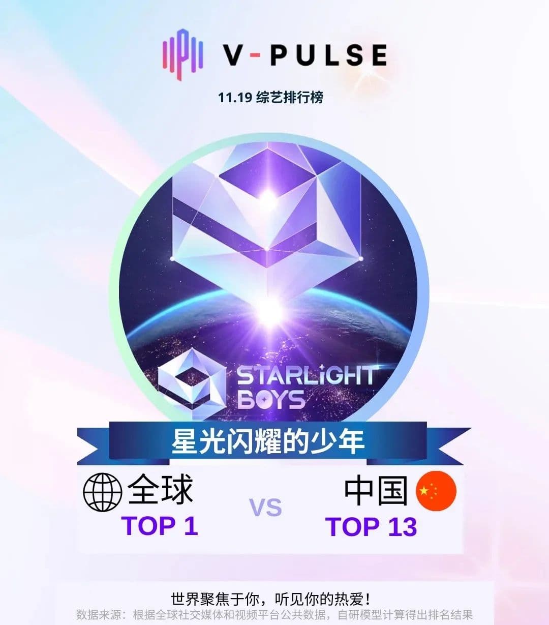 前不久,节目中的选手还登上了韩国大型音乐颁奖典礼KGMA的舞台。而根据V-Pulse海外热度榜显示,截至11月19日,《星光闪耀的少年》登顶综艺排行榜TOP1,只能说这档选秀节目的品牌影响力及选手的商业价值仍在上升。