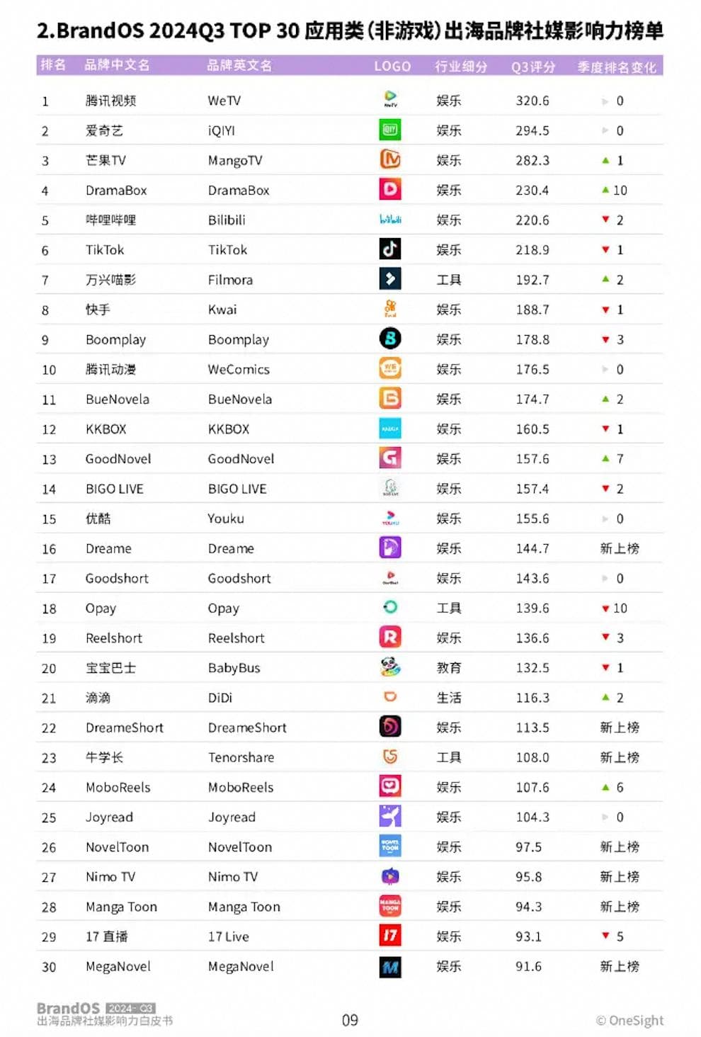 根据OneSight对2024年Q3应用类(非游戏)出海品牌社媒影响力榜单的统计,前三名分别为腾讯国际版、爱奇艺国际版、芒果TV国际版。这三家国际版在海外市场的用户量、下载量、内容质量等方面不相上下,且都以东南亚为主要市场。