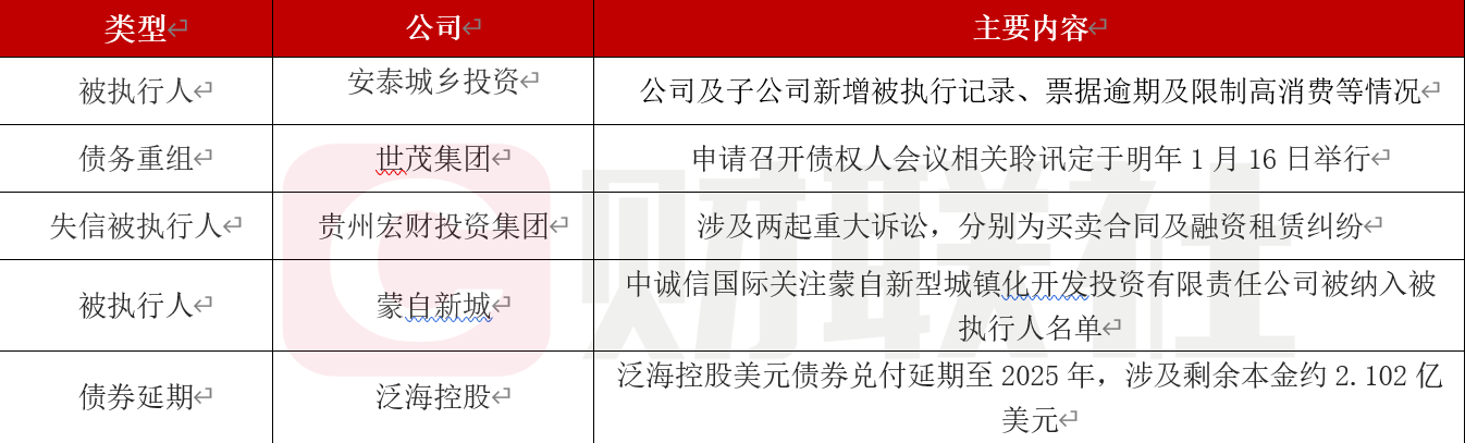 债市公告精选(11月27日)| 泛海控股2.21亿美元债券兑付延期至2025年;中诚信国际关注蒙自新城纳入执行人名单