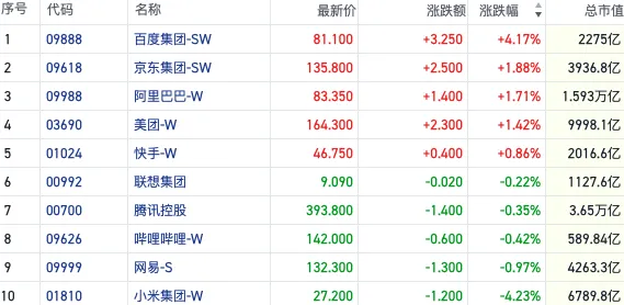 盘面上,核心科技股涨跌各异,百度涨超4%,京东、阿里巴巴涨约2%,美团涨1.42%,快手涨近1%,小米跌超4%,网易、腾讯飘绿。