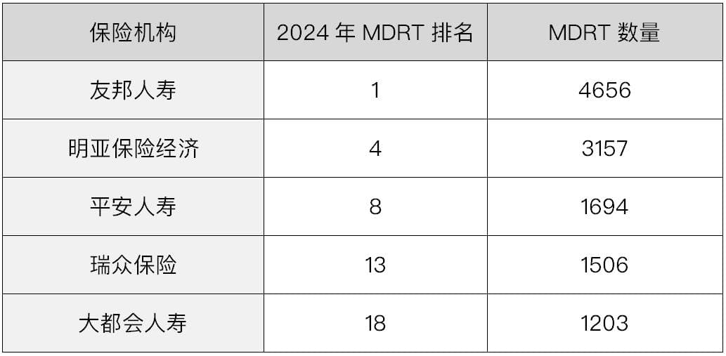 重赏之下,必有能人。据MDRT官网发布的数据,2024年全球TOP100保险机构中,友邦人寿的MDRT人数依旧排在第一位,MDRT注册人数达到4656人,占内地全部MDRT数量的23.92%。这也是自2022年以来,友邦人寿第三次拿下MDRT全球数量第一。
