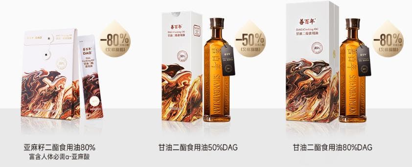 还有善百年推出50%含量和80%含量甘油二酯的亚麻籽二酯油,含有89%的不饱和脂肪酸,同时加入亚麻籽油、沙棘籽油等油脂。其产品以212℃的高烟点为特色,油烟少,适用于多种烹饪方式。