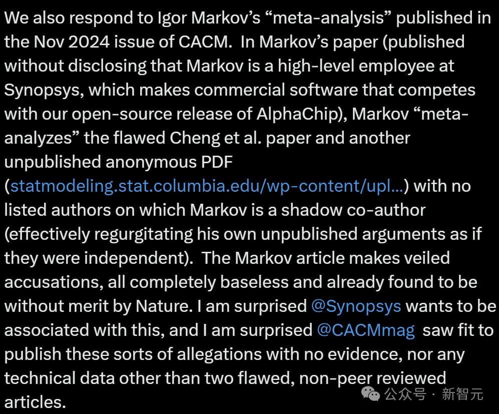 Jeff Dean表示,Markov发论文时妹说自己是Synopsys的高级员工,——Synopsys是商业EDA软件,而AlphaChip是开源的。
