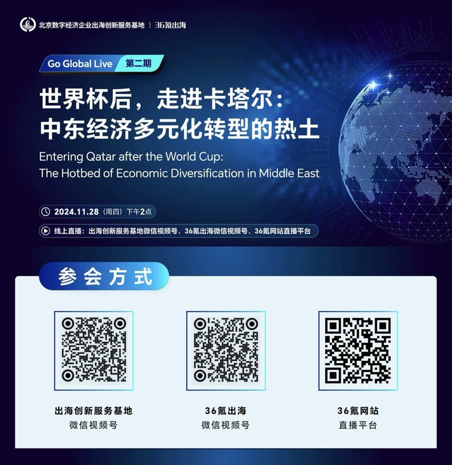 为帮助企业了解卡塔尔的市场机遇和独特优势,36氪出海将于11月28日举办线上活动,邀请卡塔尔投资促进局的代表,分享中国企业在卡塔尔经济多元化转型中的发展机遇。如果您关注中东市场、卡塔尔市场,欢迎您通过下方的出海创新服务基地微信视频号、36氪出海微信视频号、36氪网站直播平台等渠道,观看活动直播。