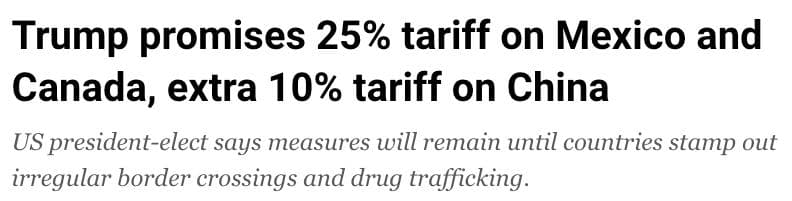 市场的焦点之一来源于特朗普证府关于关税的威胁。特朗普于周一宣布,计划对墨西哥和加拿大的产品征收25%的关税,并对中国产品实施额外10%的关税。此外,他还提出对所有进口商品征收最高20%的关税,并对中国产品加征至少60%的额外关税。