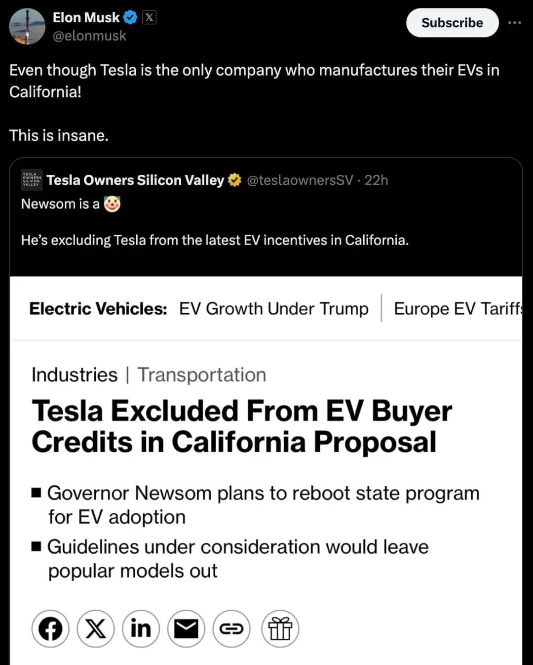 对此,特斯拉CEO马斯克在X平台强烈抨击该提案“荒谬”!指出特斯拉是唯一在加州本地生产电动车的企业,却可能被排除在外。特斯拉目前在加州拥有大量员工,包括弗里蒙特工厂的生产团队以及多个研发团队。马斯克警告,若证策实施,特斯拉或不得不削减在加州的岗位。