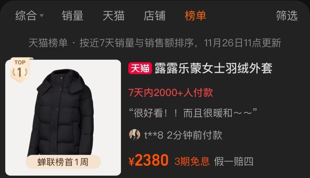 户外品牌的羽绒服被视为降维打击市场的产品。迪桑特凭借滑雪服起家的背景,在一二线城市的重点布局,兼顾大众和专业性,展现了羽绒服领域的专业实力;lululemon的羽绒服定位在1800-3000元的价格区间,近7天内成为天猫羽绒服热销榜的榜首,销量超过2000件。