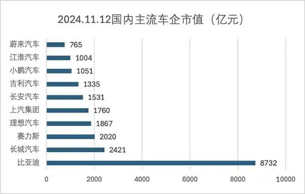 随着各种关于尊界的信息不断发酵,江淮的股价被彻底点燃,近两个月股价上涨70%,自年内低点至11月12日的高点暴涨3.3倍,市值最高超过千亿大关,跃居国内上市车企市值第九名(11月12日),甚至超过了曾经的合作方蔚来汽车。