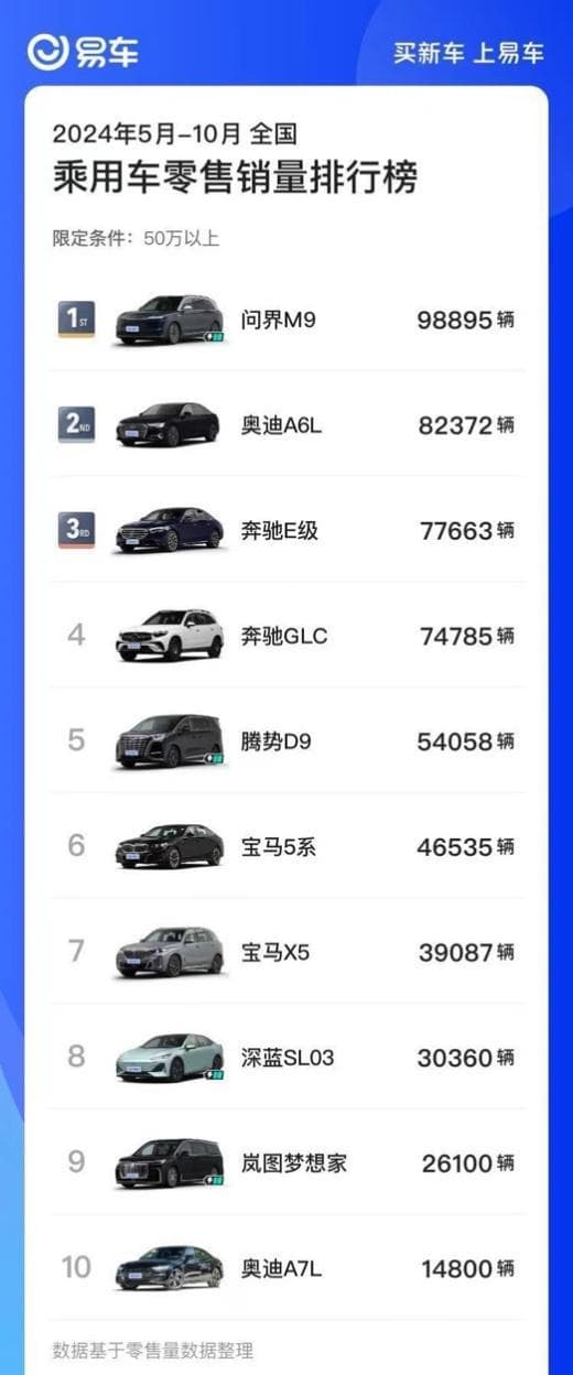 目前,鸿蒙智行中,最成功的要属赛力斯。尤其是问界M9打破了BBA的封锁,连续6个月位居50万以上乘用车销量第一名,彻底重塑市场格局。