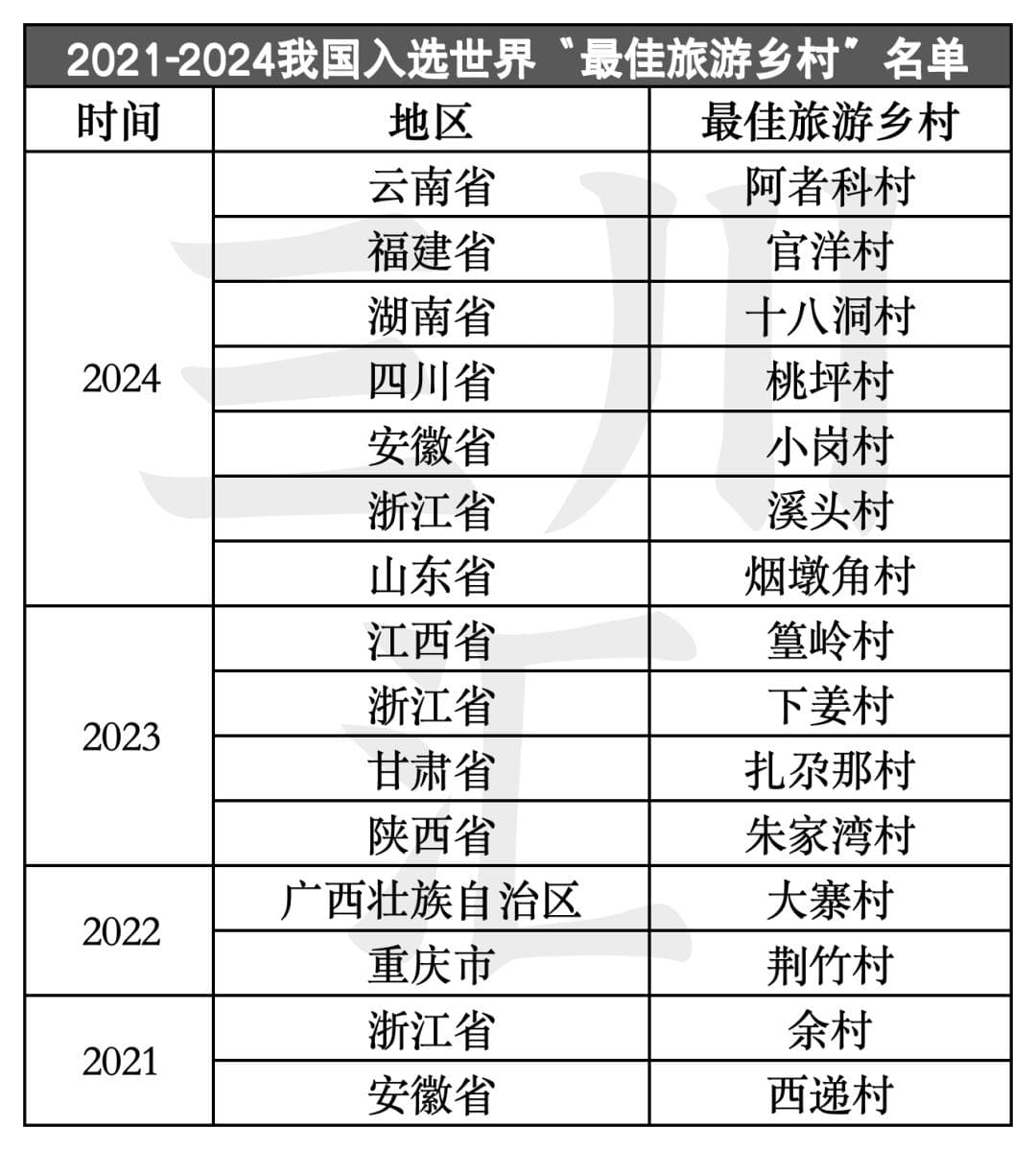 11月15日,2024年“最佳旅游乡村”名单发布,我国申报的云南阿者科村、福建官洋村、湖南十八洞村、四川桃坪村、安徽小岗村、浙江溪头村、山东烟墩角村7个乡村入选,成为本届入选最多的国家。