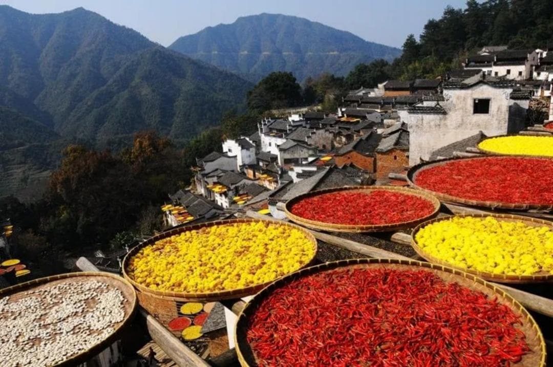 篁岭村的晒秋文化是其最大的特色。每年秋季,当地村民会将收获的农作物如玉米、辣椒、南瓜等摆放在房屋的晒架上,形成一幅幅色彩斑斓的晒秋图,成为了一道独特的风景线。这种传统的晒秋习俗不仅体现了农耕文化的精髓,也成为了摄影爱好者和画家创作的灵感来源。