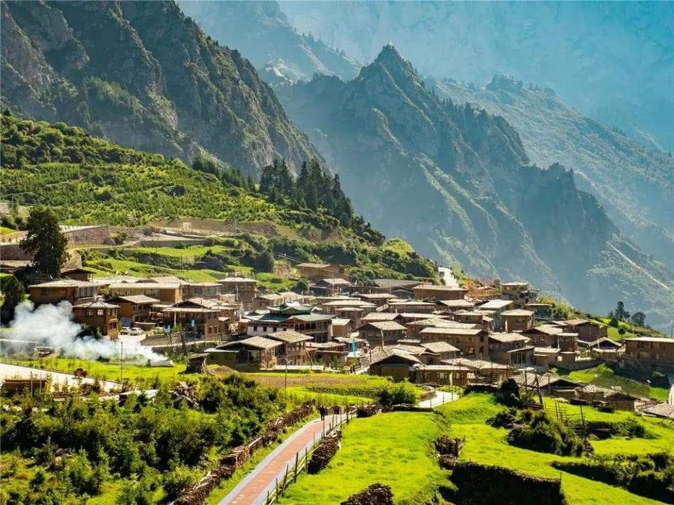 扎尕那村处青藏高原东部边缘, 是一个藏式古村落,以其壮丽的自然风光和丰富的藏族文化而闻名,被誉为“西北香格里拉”,是探险旅游和摄影爱好者的天堂。扎尕那村自然环境优美,自然山体、水系、农田、林地、村落共同组成 “山、水、田、村”的格局,展现出“远山苍翠、近村烟火、河水清幽、农田顷顷”的美好田园生活风貌。