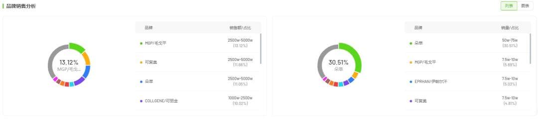 根据飞瓜平台信息显示,目前,进入与辉同行直播间的美妆品牌共有137个,包含了毛戈平、可复美、朵萃、可丽金、彩棠、欧莱雅、理肤泉等国内外知名美妆品牌。从销量上来看,朵萃品牌的占比最高,为30.51%,销量为50万-75万件,其次是毛戈平和伊帕尔汗;从销售额上来看,则是毛戈平排名第一,销售额为2500万元-5000万元,占比为13.12%,可复美、朵萃则依次排在第二、三位,且它们的占比均超过了11%。