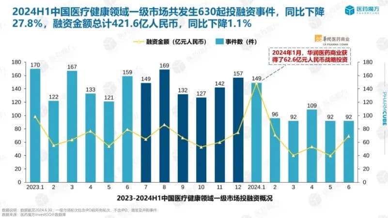 根据医药魔方数据,中国创新药一级市场融资金额2020年为869亿元、2021年为877亿元,2022年下降到433亿元,2023年进一步降为309亿元。今年上半年,中国医疗健康领域一级市场共发生630起投融资事件,同比下降27.8%;融资总额为421.6亿元,同比下降1.1%。若剔除华润医药在今年1月份完成的62.6亿元战略融资事项,融资总额同比下降约15.8%。