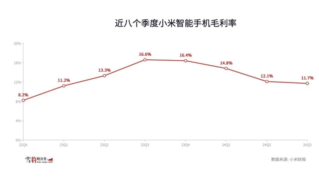 2024年前三个季度,小米智能手机业务的毛利率呈环比下跌态势,分别为14.8%、12.1%、11.7%。作为对比,2024财年第四财季(自然年2024年第三季度),苹果公司硬件端的毛利率为36.3%。