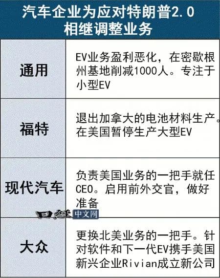 特朗普对于依靠补贴推进EV普及态度消极。有估算称,如果补贴减少、关税导致价格上涨,美国的EV销量将减少3成。车企开始调整战略,通用在密歇根州的研发基地削减1000人,福特退出加拿大的电池材料生产,大众……