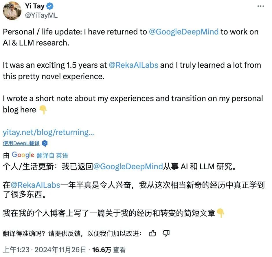 11 月 26 日,Yi Tay 在社交平台 X 及个人博客上分享自己的最新决定——重回 Google DeepMind,从事 AI 和 LLM 研究。
