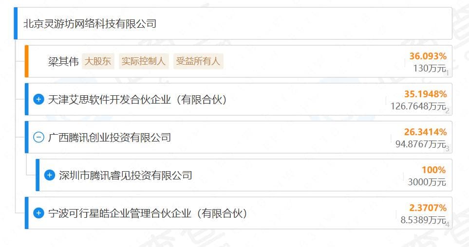 企查查的数据显示,广西腾讯创业投资有限公司持有北京灵游坊网络科技有限公司26.34%的股份,后者是呼声最高的《影之刃零》的母公司。