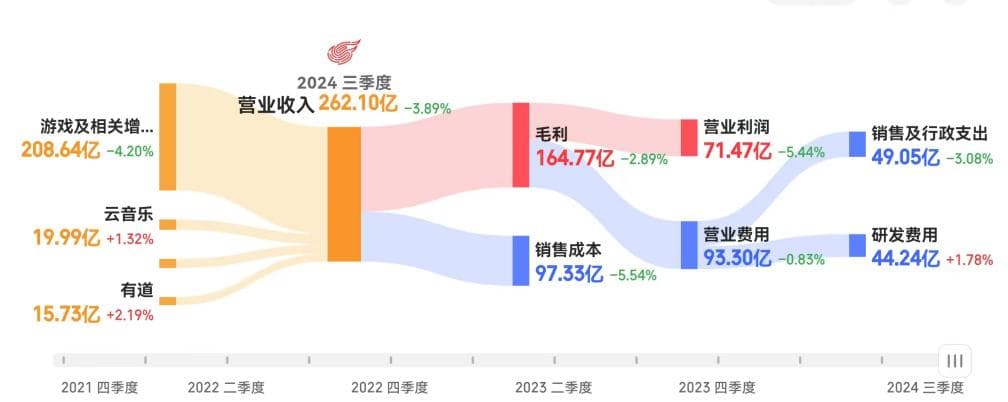 2024第三季度,网易的营业收入为263亿元,同比下降3.9%,其中游戏板块的收入同比减少4.2%;净利润为65亿元,同比减少16.7%。