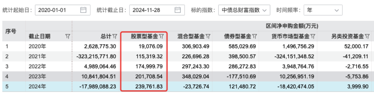 此前的2020年至2023年,基金公司净申购旗下股票型基金规模也在持续加大,分别为1.91亿元、11.53亿元、17.50亿元、20.17亿元。