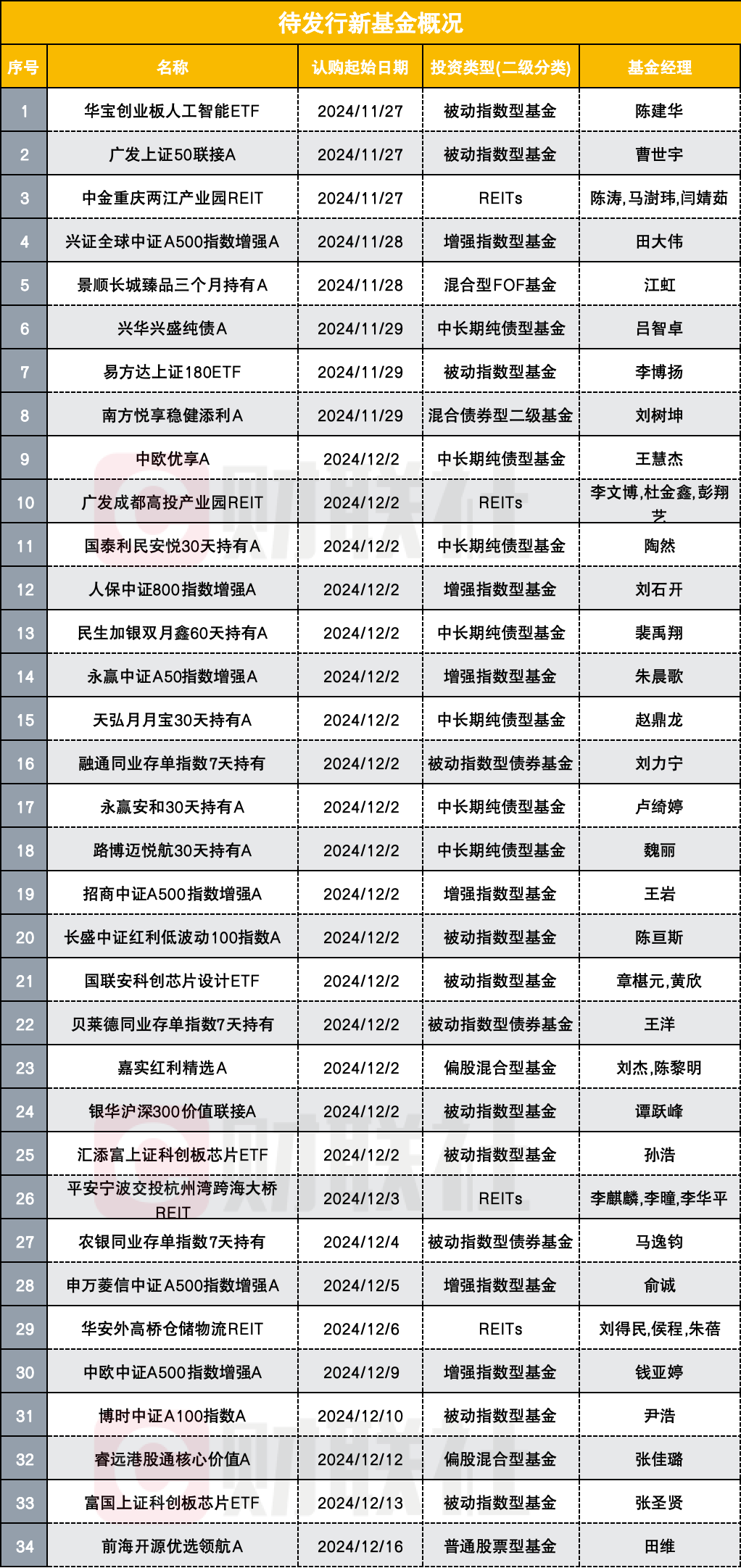 另有兴华兴盛纯债、天弘月月宝30天持有、贝莱德同业存单指数7天持有等11只固收类基金陆续发行,以及一只FOF——景顺长城臻品三个月持有将在12月份发行。
