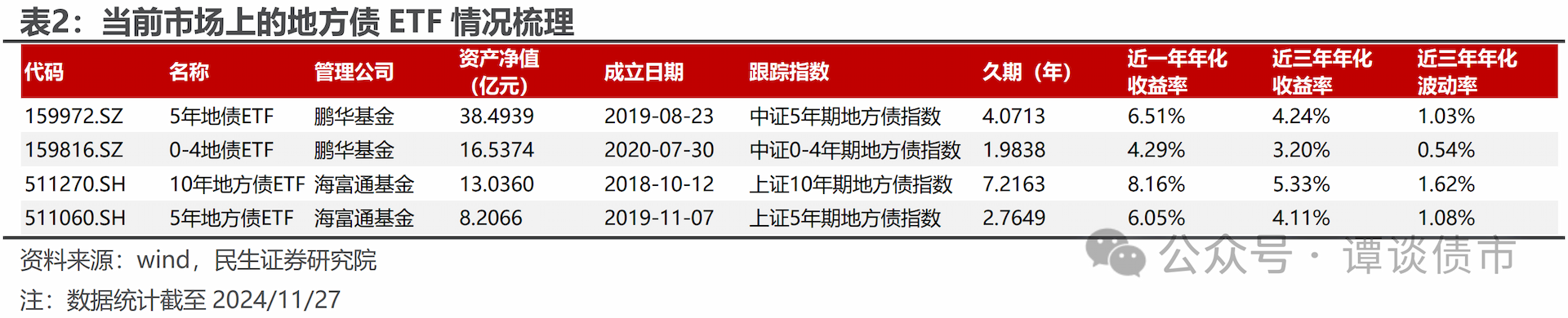 截至2024/11/27统计数据,地方债存量规模目前已突破45万亿元,占全部利率债(国债+地方债+政金债)存量的比例已超47%,存量只数超1.1万亿只,发行人涵盖37个地方政府,故而通过ETF来参与地方债投资也愈发受到市场关注。