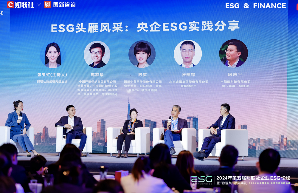 11月29日,在财联社、国新咨询联合主办的2024第五届财联社企业ESG论坛圆桌环节,财联社政经研究院主编张玉虹担任主持人,与中节能环境保护股份有限公司(以下简称“节能环境”)副总经理郝家华、国投中鲁果汁股份有限公司(以下简称“国投中鲁”)副总经理殷实、金隅集团董事会秘书张建锋、申能碳科技有限公司总经理顾庆平4位嘉宾,围绕赋能绿色经济,分享了企业在推动行业绿色健康发展方面的探索与成果。