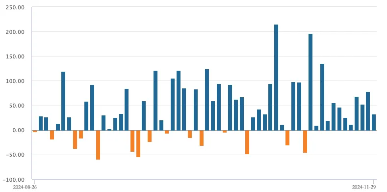 11月29日,南向资金成交549.73亿港元,当日净流入约32.78亿港元。其中沪港股通净流入2.94亿港元,深港股通净流入29.84亿港元。