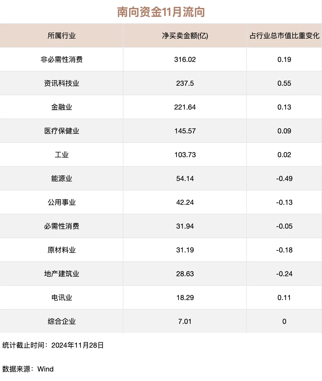 值得留意的是,11月资金还明显加仓了科技股,资讯科技行业获净流入约237亿港元,环比上月规模接近翻倍。
