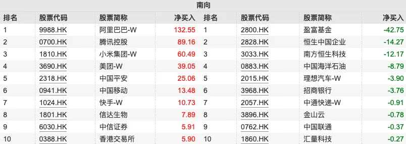 大幅净流入:阿里巴巴-W(09988.HK)132.55亿港元;腾讯控股(00700.HK)89.16亿港元;小米集团-W(01810.HK)60.49亿港元;美团-W(03690.HK)39.05亿港元;中国平安(02318.HK)25.06亿港元。