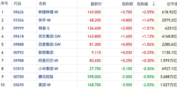 盘面上,今日核心科技股一度全线上涨,但午后部分转跌。收盘美团跌2%,腾讯、小米飘绿,快手、网易、京东、百度仍涨超1%。